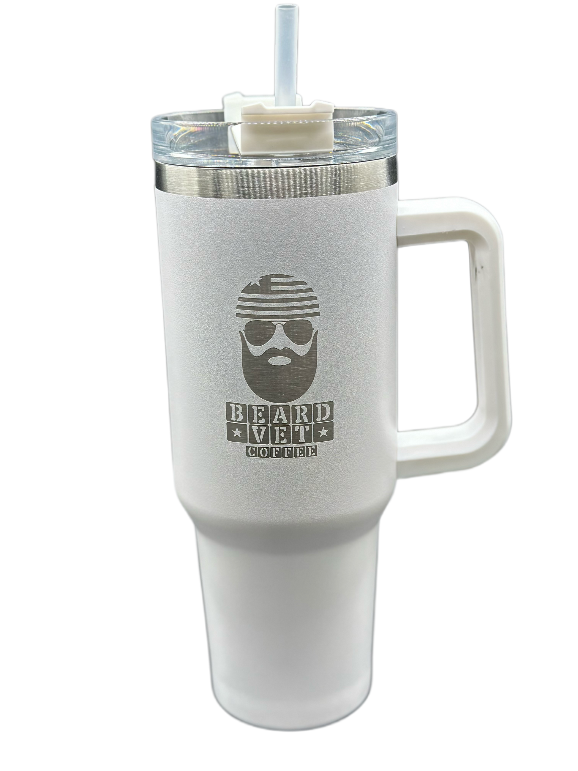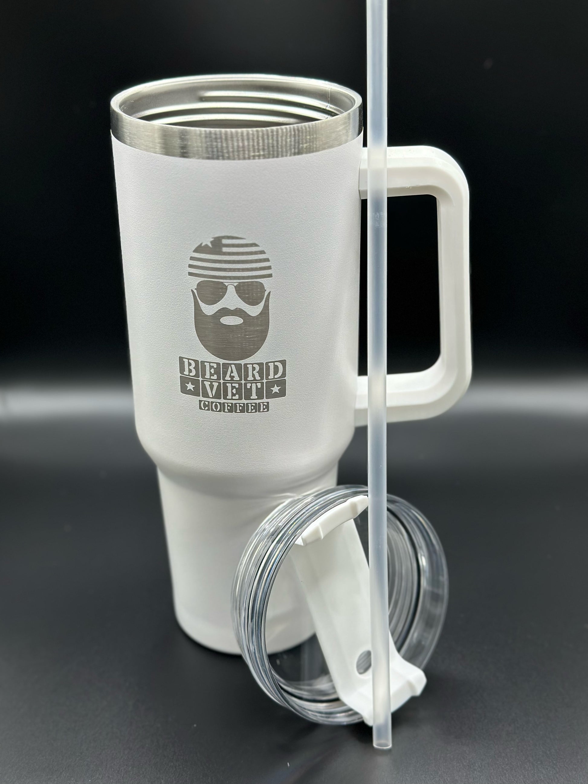 40 oz. Tumbler with lid and straw. Dishwasher safe. This thing is Huuuuuuuuge!